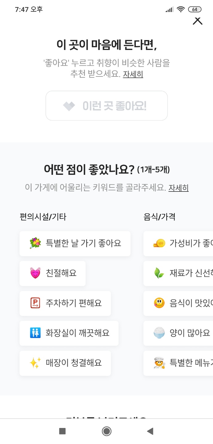 인증완료를 누르면 별점과 가게가 어땠는지 키워드별로 골라줄수있습니다