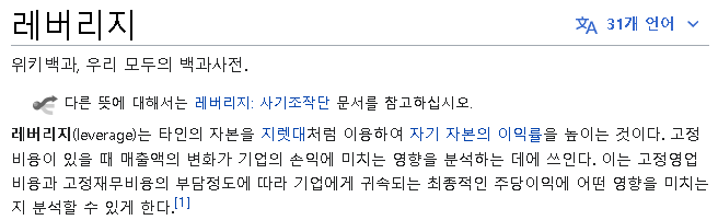 레버리지는 타인의 자본을 이용해 자기자본의 이익률을 높이는것을 말한다
