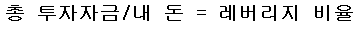 레버리지 효과는 부채가 얼마나 있느냐에 따라 달라지는데 총 투자자금 을 내 돈으로 나눈숫자를 레버리지 비율 이라고 한다