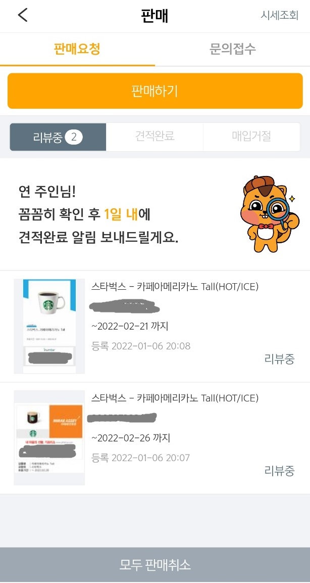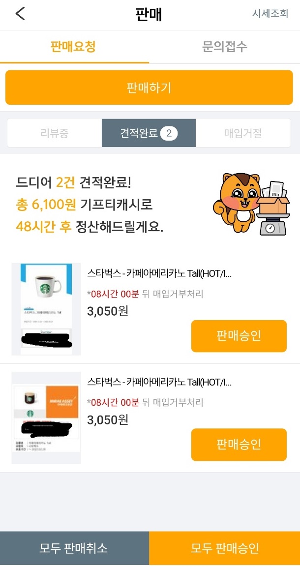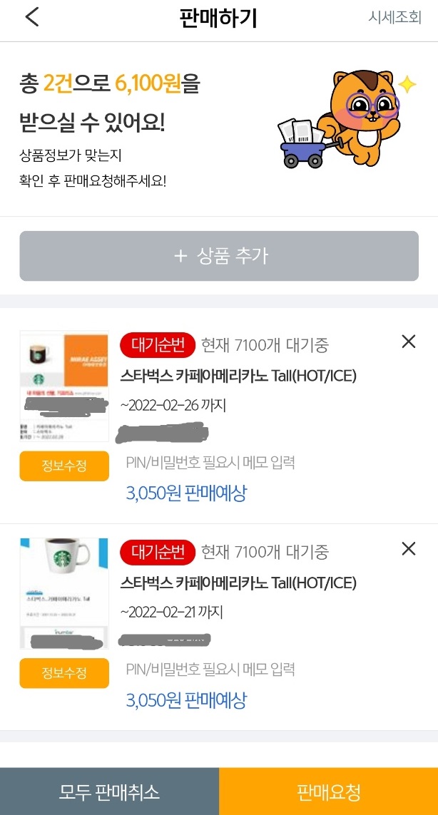 내가 접수한 아메리카노기프티콘은 장당 3050원으로 판매가 예상된다고 되어있다.