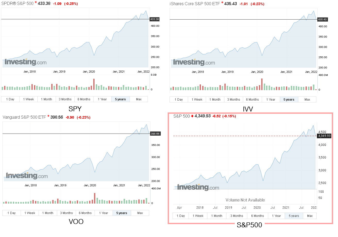 SPY, IVV, VOO와 S&P500지수의 차트 비교