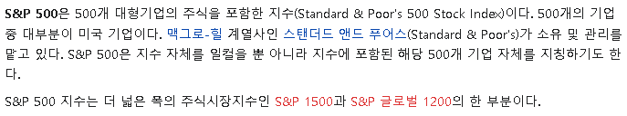 스탠다드앤 푸어에서 선정한 500개의 우량 기업에 분산투자가 되기 때문에 단일종목에 투자하는것보다 변동성이 적고 안정성이 높습니다
