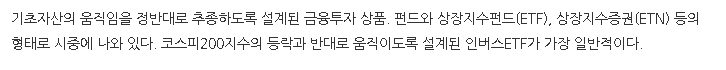 위의 설명과 같이 반대로 추종되도록 설계되어있어 추정 지수가 하락하면 오히려 수익을 얻는 상품이다