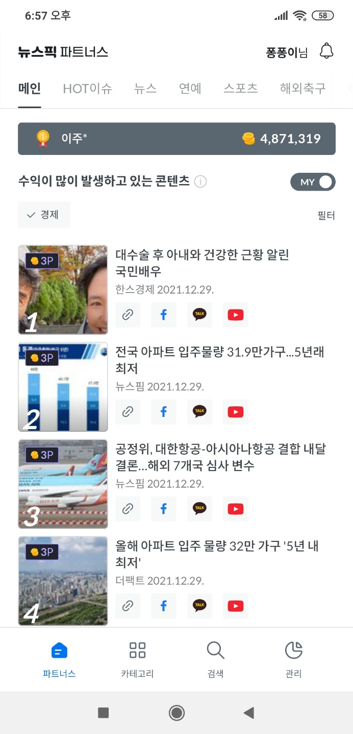 뉴스픽 파트너스는 내가 링크한 기사를 사람들이 보면 클릭수에 따라 돈이 들어오는 시스템입니다