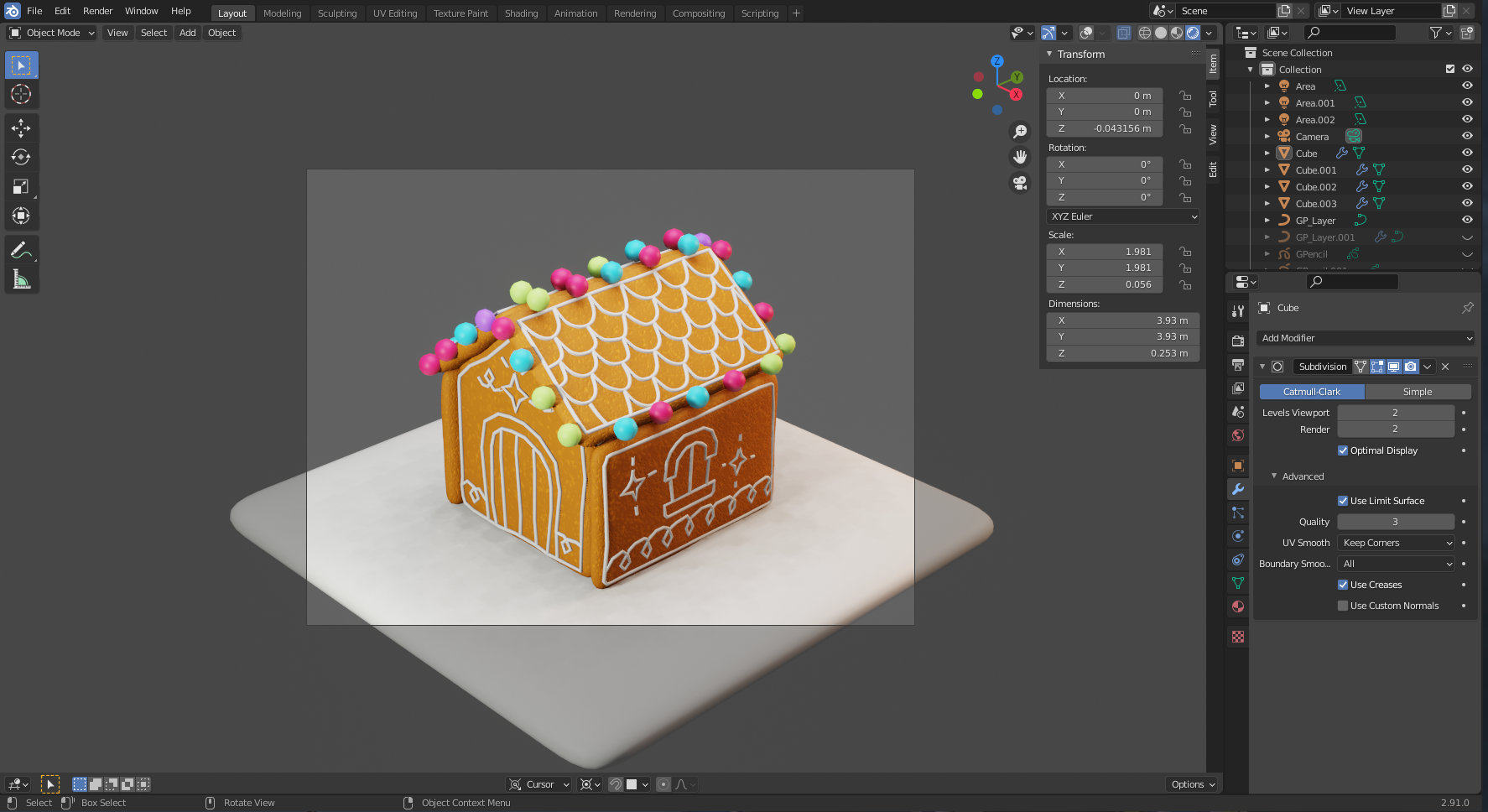 모자와 목도리를 두른 3단눈사람, 전구가 연결된 캔디케인,집아래에 눈 쌓인 지형..(그리고 알록달록캔디들을 좀 더 작게 할것, 집의 스케일 조정을 할것..욕심이 많아지네)