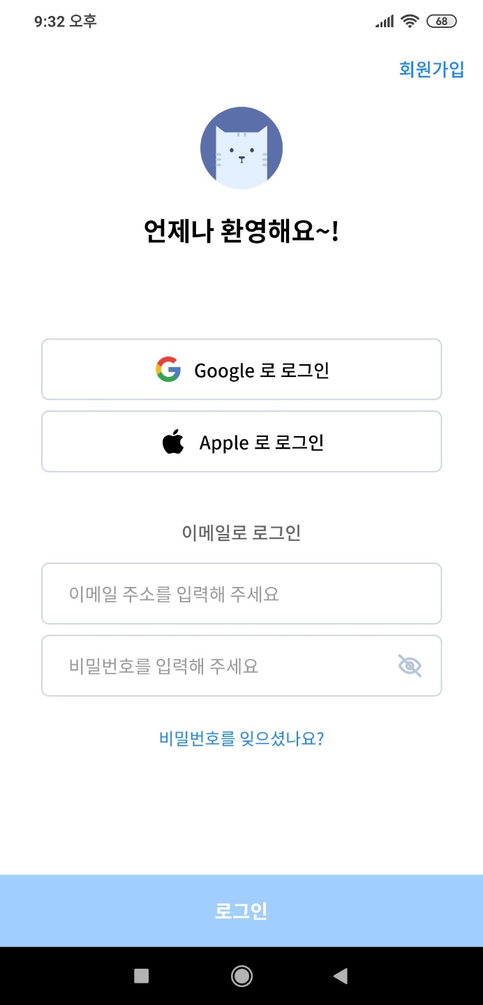 이메일이나 구글, 애플로도 로그인 가능합니다 저는 이메일로 가입했습니다